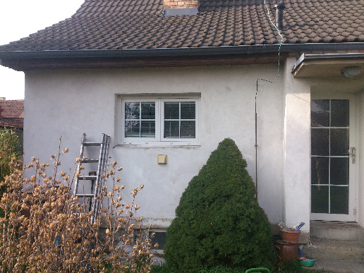 Zateplení fasády rodinného domu EPS 70F tl. 120 mm, s probarvenou finální omítkou silikon K 1,5 mm. Lepení XPS na soklovou část s finální omítkou MosaikTop. Vše provedeno systémem BaumitDUO.