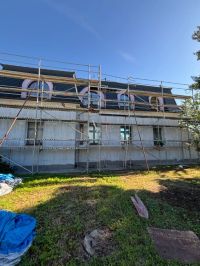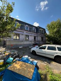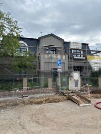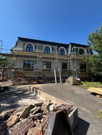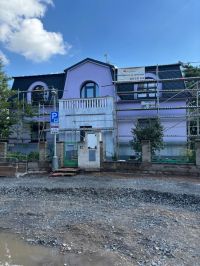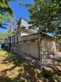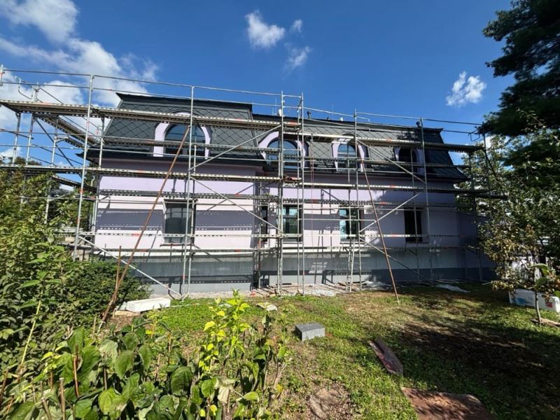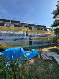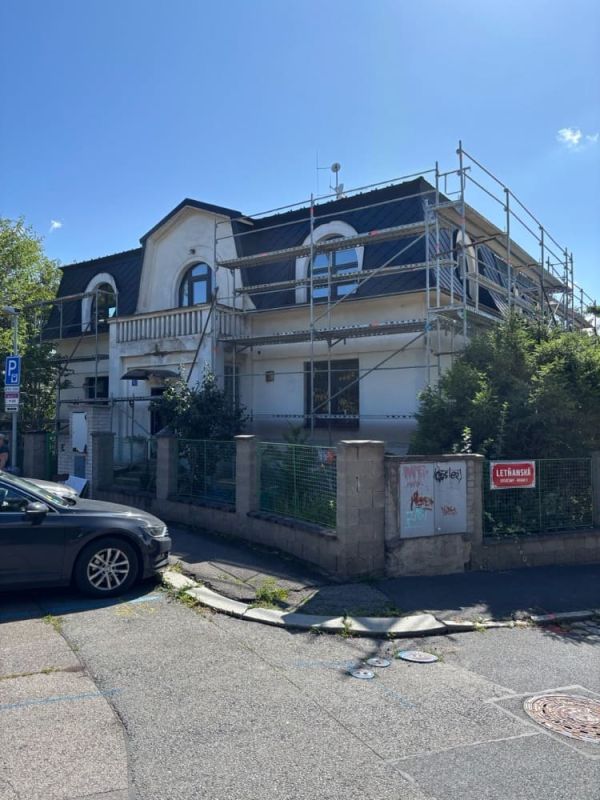 Realizace zateplení velké vily na Praze 9 proběhla systémem z děrovaného polystyrenu CLIMA SD Plus. Ještě před samotným zateplením bylo nutné oklepat nesoudržné části původní omítky a následně dorovnat podklad jádrovou omítkou, aby byl povrch správně připravený pro lepení izolantu.